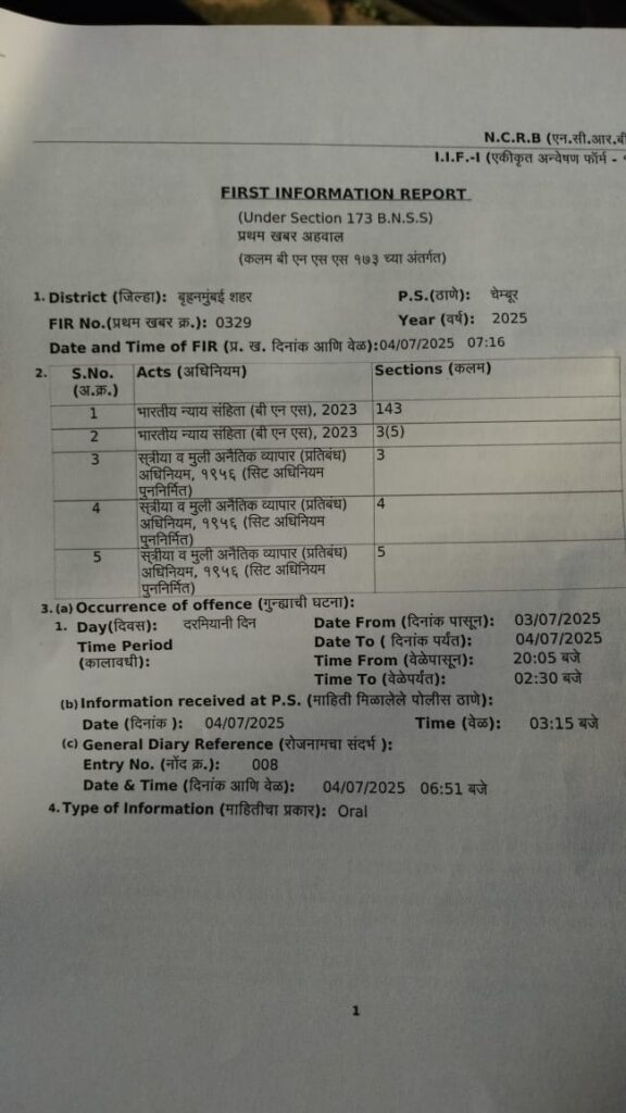 यह छापा चेंबूर पुलिस स्टेशन के क्राइम डिटेक्शन यूनिट, मानखुर्द पुलिस के अधिकारी और आरसीएफ पुलिस के सहयोग से पंचों की उपस्थिति में डाला गया। सभी आरोपियों के विरुद्ध अनैतिक देह व्यापार (रोकथाम) अधिनियम 1956 की संबंधित धाराओं के तहत मामला दर्ज कर आगे की जांच की जा रही है।